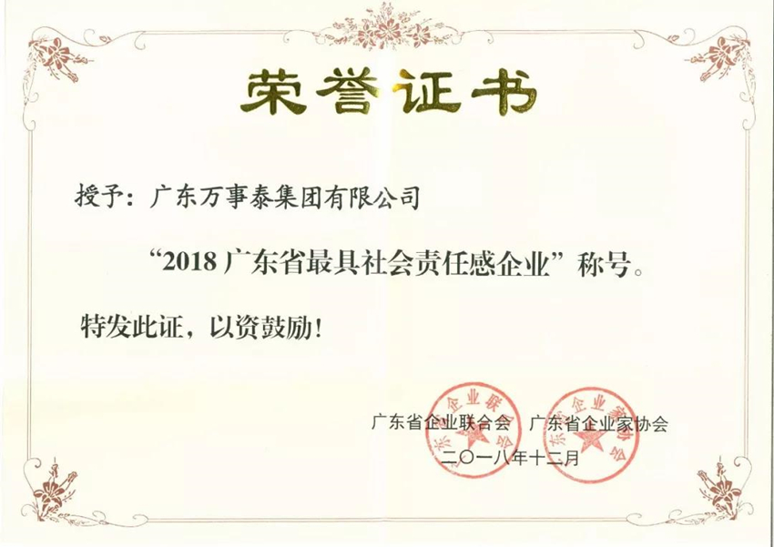 「喜讯」万事泰荣获“2018广东省最具社会责任感企业”称号推荐