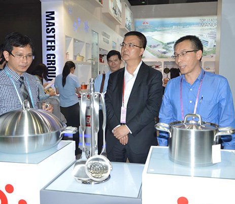 本届交易会推出的“MASTER AI COOKING”(智能厨具)受到各国客商的晴睐。云浮市副市长胡海运在百忙中专程到集团展位视察和了解集团在广交会的展览情况。并鼓励集团领导必须要搞科技创新、产品转型升级,打造自己的品牌战略。国家轻工商会会长王忠奇也亲临集团展位视察,集团董事长梁桂泉、副总裁刘炳耀接待陪同他们参观了展位新产品。