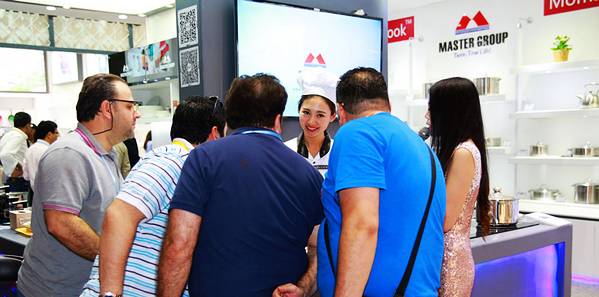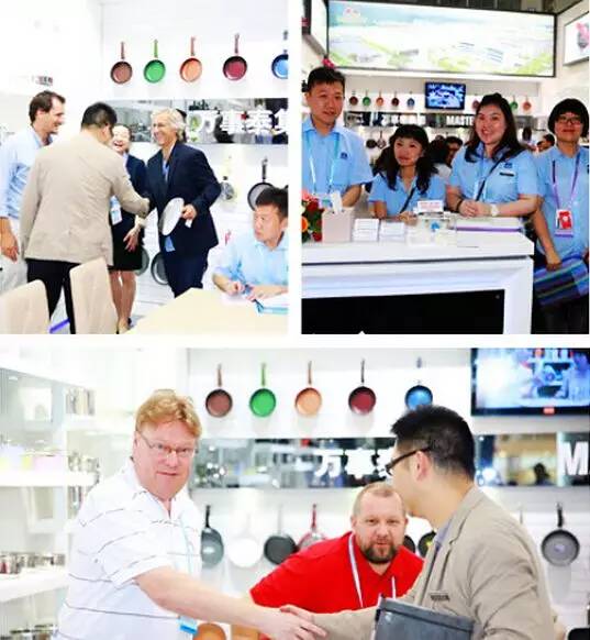 万事泰特别策划安排了中英双语美女主持人与模特厨师演示一同配合的演示模式,美女厨师为往来客商演示万事泰2015新研发的智能操控厨具,同时主持人用中英文分别介绍厨具的优势亮点。每每介绍一开始,便吸引了大批智能厨房爱好客商驻足了解,别具吸引力。