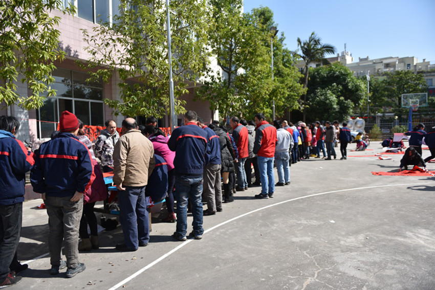 在麦友安老师的带领下,书法家一行10多人早早地来到了万事泰集团篮球场。一到达,书法家们立即在万事泰工作人员预先准备好的桌子上摆上砚台,倒墨、磨笔。10位书法家一字排开,挥斥方遒,员工们接踵而至,现场墨香飘逸,喜庆非凡。