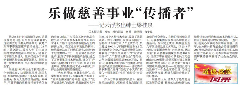 梁桂泉认为,培养人才是帮助地区发展的关键,教育的扶持和智力的扶持才能起到治标又治本的作用,从根本上解决地区的发展问题。一直以来,他关心家乡的教育事业发展。去年,他为新兴教育基金会的建设捐资200万元,改造完善王香地小学的基础设施出资40万元,为教育事业发展慷慨解囊的善举赢得了社会公众的认可。