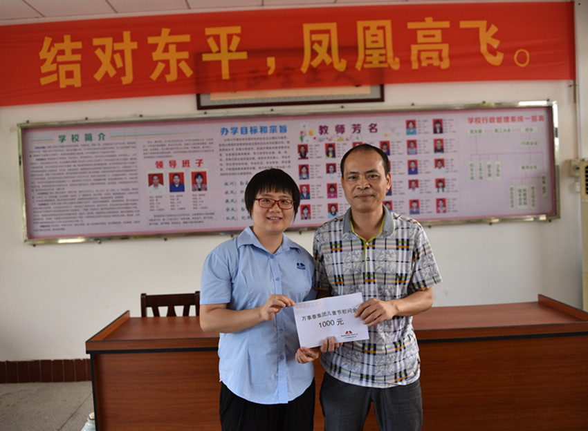 万事泰集团来到集团外来工子女较多的凤凰小学慰问,并将慰问金交付到魏校长手中。