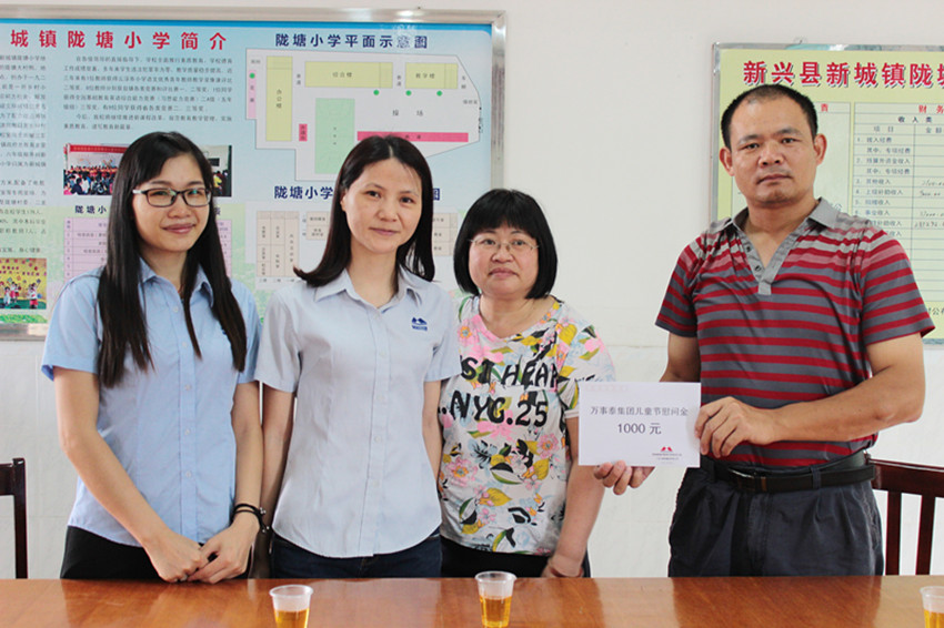 集团讯 时值六一儿童节到来之际,2016年5月27日下午,万事泰集团工会、行政部以及企业文化部工作人员前往新兴县内5所外来工子女就读小学慰问,集团代表与孩子们开心的分享节日的快乐,送去慰问金,并与孩子们合影留念。