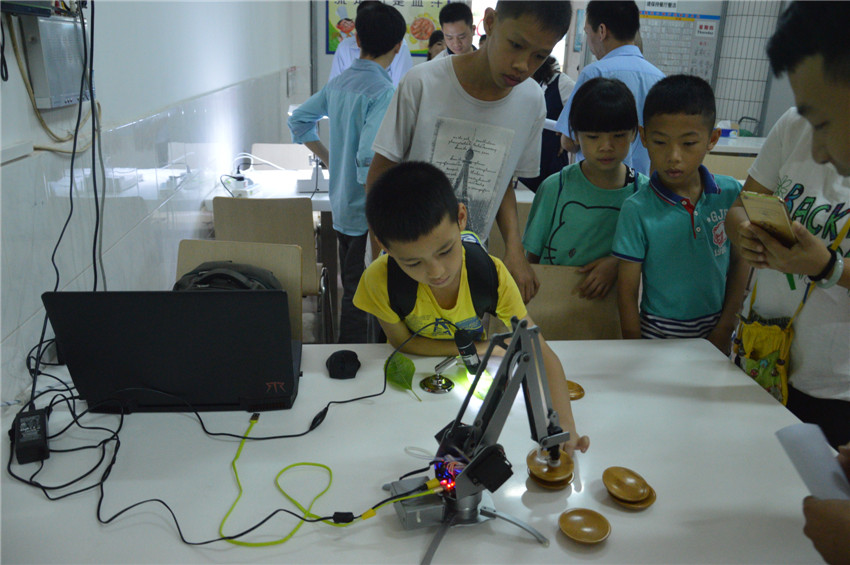 讲座上现场展示了集团先进仪器uArm机械臂、500倍电子显微镜、wifi智能开关远程操作家电设备等轻松趣味又贴近生活的小环节,让小朋友们可以通过先进的科学设备仪器和生活的有机结合,近距离感受科技改变生活的意义,培养科学创新的兴趣,勇于思考、发问和表达,寓教于乐。
