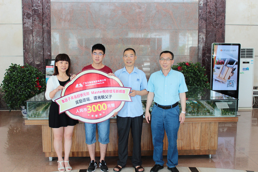 集团领导与员工齐聚总部大堂,共同分享喜悦。并在此进行了简单的颁奖仪式,集团常务副总裁刘炳耀对谭光锐进行颁奖。