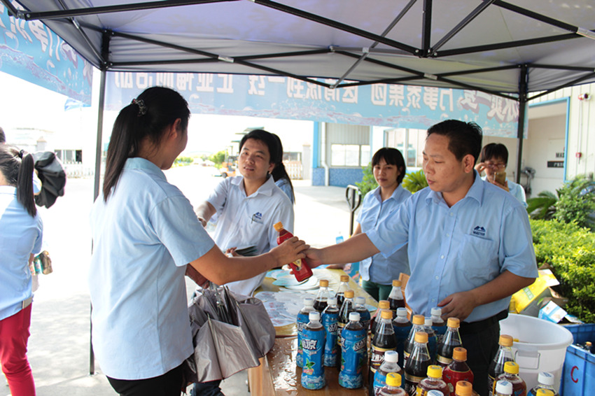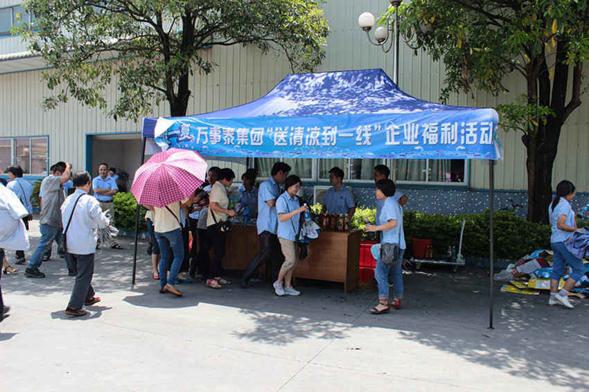 当天下午1时许,集团总部中门、事业二部门口,两个蓝色的帐篷,“万事泰集团送清凉到一线企业福利活动”横幅醒目显眼,在高温天气里营造了凉爽的氛围。近5000支不同品类的瓶装饮料已在冰块水桶里冰镇起来,集团订制的便携小扇子也整齐摆放,静候上班的员工到来。总裁办主任梁贤武、行政部副经理陈焕文、工会主席梁洪光等集团管理层亲自上阵,为辛苦勤奋的一线员工亲自送上一瓶冰镇饮料,道一声“您辛苦了,清凉一下!”上班时间一到,一线员工们排成整齐的队伍领取集团发放的冰镇饮料,拿着印有集团品牌和解暑小常识的扇子,开心走向各自的岗位。