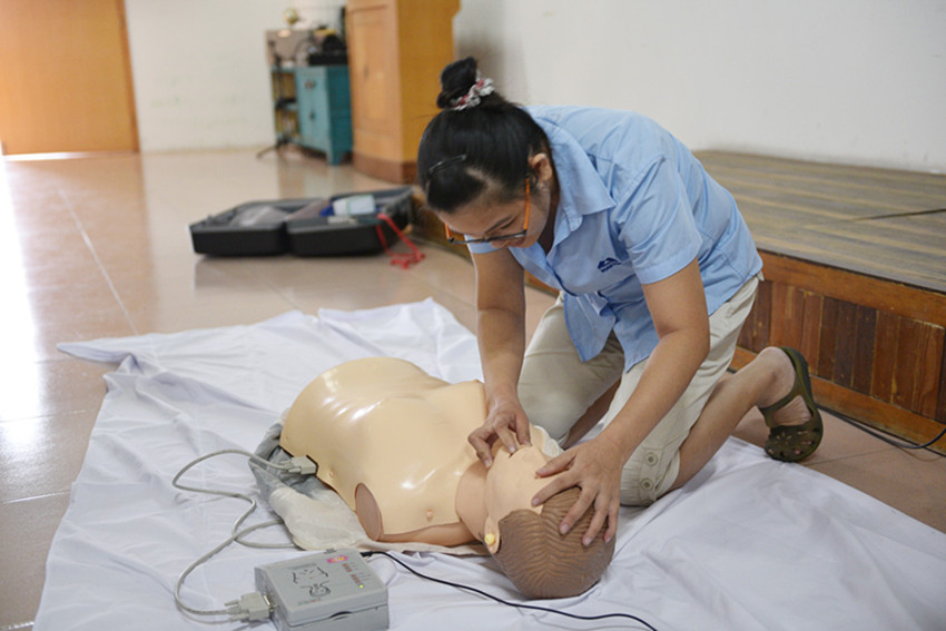 员工在积极练习急救技能