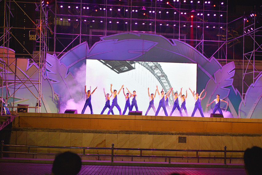 广场内灯光璀璨,欢乐的音乐声此起彼伏,舞台下座无虚席,场面热闹非凡。晚会以一支欢快而激扬的舞蹈拉开了序幕,歌唱家们美妙的歌声吸引了台下不少群众一起和声吟唱,一曲风靡全国的神曲《小苹果》更是让台下小观众们手舞足蹈,还有相声、魔术等精彩节目都引得台下观众掌声阵阵。