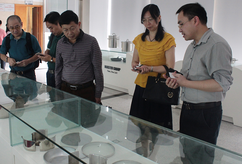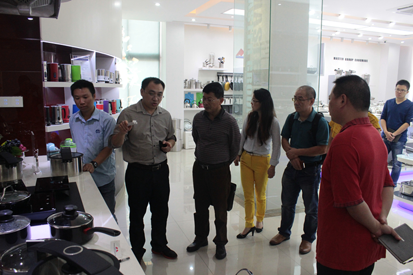 随后调研组的领导们来到了万事泰智能厨房多功能展厅参观,总裁办助理欧剑华为调研组的领导们介绍了集团公司不锈钢产品、铝制品的工艺特点,以及万事泰自主研发的智能烹饪台E-cook table和带有温度传感器的不粘锅,为调研组一行展示了万事泰科技创新转型升级的新产品和新方向。