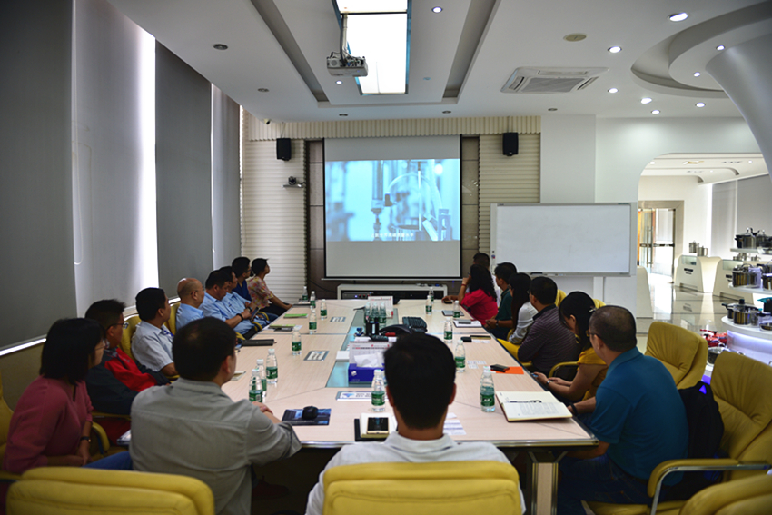 最后,在欧剑华的带领下,调研组的领导们与集团技术中心开发人员、电器公司技术开发人员纷纷入座四楼展厅会议室,一同观看了万事泰集团视频介绍。