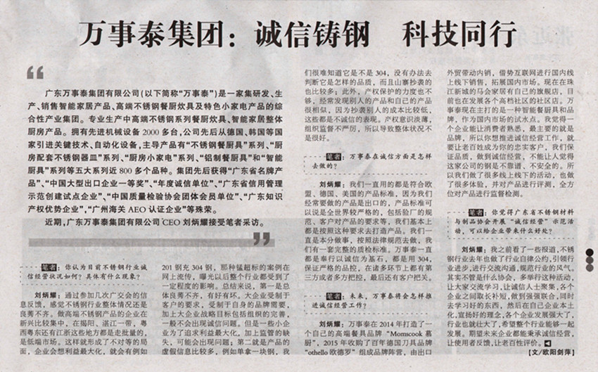 刘炳耀:万事泰在2014年打造了一个自己的高端餐具品牌“Momscook慕厨”,2015年收购了百年德国刀具品牌“othello欧德罗”组成品牌阵营,由出口外贸带动内销,借势互联网进行国内线上线下销售,拓展国内市场。现在在珠江新城的马会家居有自己的旗舰店,目前也在发展各个高档社区的社区店。万事泰现在主打的是一种智能餐厨具和品牌,作为国内市场的试水点。我觉得一个企业能让消费者熟悉,最主要的就是品牌,所以你想推进诚信经营工作,就要让老百姓成为你的忠实客户,乐竞电竞,全球赛事资讯,一站式竞猜观赛平台保证品质,做到诚信经营,不能让人觉得这家公司的钢是不靠谱、不安全的。所以乐竞电竞,全球赛事资讯,一站式竞猜观赛平台做了很多线上线下的活动,也做了很多体验,并对产品进行评测,全方位对产品进行监督检测。