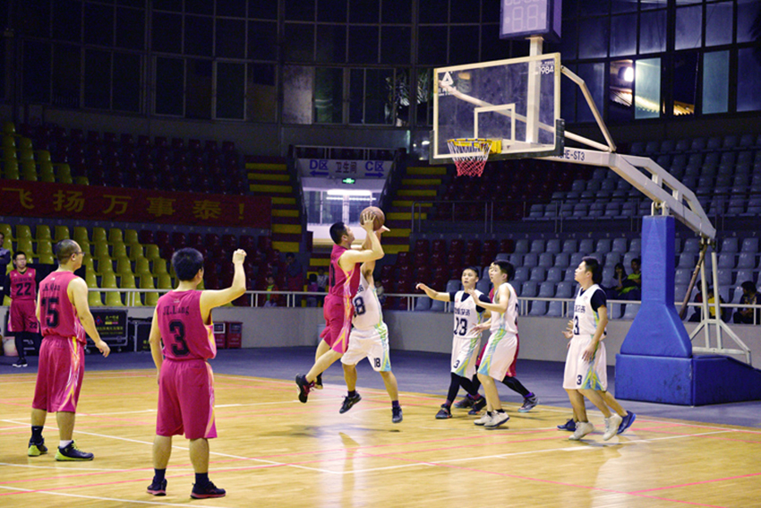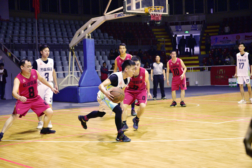在男子篮球冠军争夺战上,总部联队与万富投资进行激烈角逐。