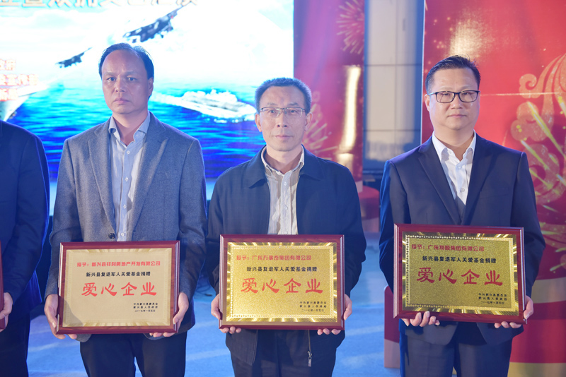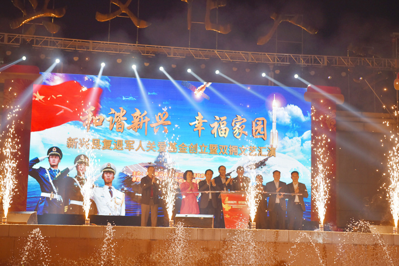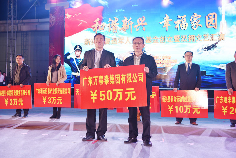 集团讯 1月5日晚上,在新兴县文化广场隆重举行了新兴县复退军人关爱基金创立暨双拥文艺汇演。市委副书记、政法委书记袁锦权,市人大常委会副主任梁锦波,副市长钟汉谋、市政协副主席王莉莉,县委书记唐谊,县委副书记、县长梁子财,县人大主任梁锦钊,县政协主席梁国华、万事泰集团常务副总裁刘炳耀等爱心企业家出席了此次盛会。