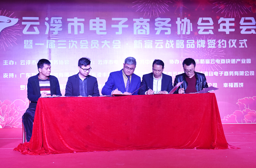 集团讯 2017年1月10日下午4时许,2017云浮市电子商务协会年会暨一届三次会员大会在云浮市新富云电商快递家居产业园内日常召开,同期,并与新富云电商快递产业园达成合作意向,举办“新富云战略品牌签约仪式”。