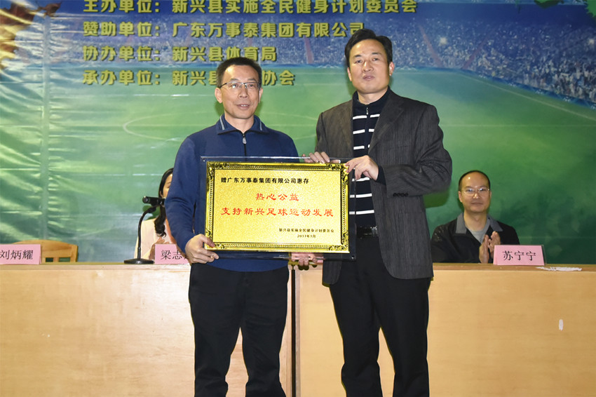 万事泰集团常务副总裁接过新兴县县长梁子财颁发的荣誉牌匾并合影留念!