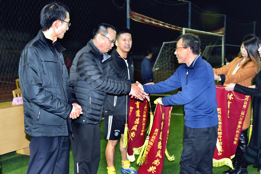 新兴县县长梁子财为得奖球队颁奖并合影留念!