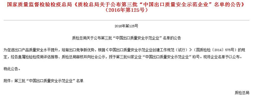 导读:“中国出口质量安全示范企业”是质检总局授予出口企业的质量最高荣誉,代表着当代和未来中国出口工业发展的实力和先进水平。入选示范企业作为质量引领标杆,可享受质检总局赋予的进出口贸易便利化政策,如出口法检商品免予检验,出口法检目录外商品免予监督抽查,进口法检原材料和零部件凭质量安全声明或第三方检测结果免予检验,优先提供国外技术法规、标准、合格评定程序等信息和培训,支持开展名牌创建活动等10项优惠措施。