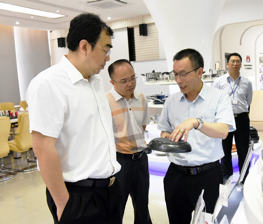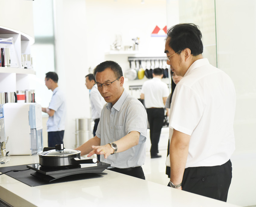 调研团一行先后来到全景厂区沙盘模型、四楼智能餐厨具产品展示厅,刘总向大家介绍了荣获德国红点奖的智能微压锅、广交会上备受关注的智能健康大厨房等系列产品。调研团对万事泰集团近年来在转型升级的道路上收获到的累累硕果表示赞叹不已。