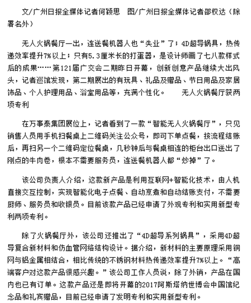 无人火锅餐厅一出,连送餐机器人也“失业”了;4D超导锅具,热传递效率提升7%以上;只有5.3厘米长的打蛋器,是设计师画了七八款样式后的成果……第121届广交会二期昨日开幕,创新创意产品继续大出风头,记者巡馆发现,第二期展出的有玩具、礼品及赠品、节日用品及家居饰品、个人护理用品、浴室用品等,充满个性化。无人火锅餐厅获两项专利