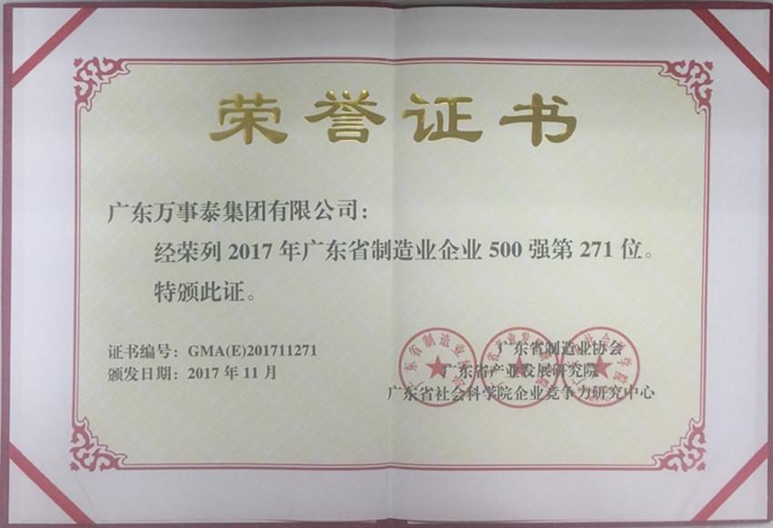 集团讯 11月28日,由广东省制造业协会、广东省产业发展研究院、广东省社会科学院企业竞争力研究中心共同主办的2017广东省制造业发展年会暨广东制造业500强企业峰会在东莞隆重举行。此次发布的2017年广东省制造业500强企业名单,万事泰再次成功入选,位列第271位,万事泰技术中心副总经理胡志才出席了本次会议。