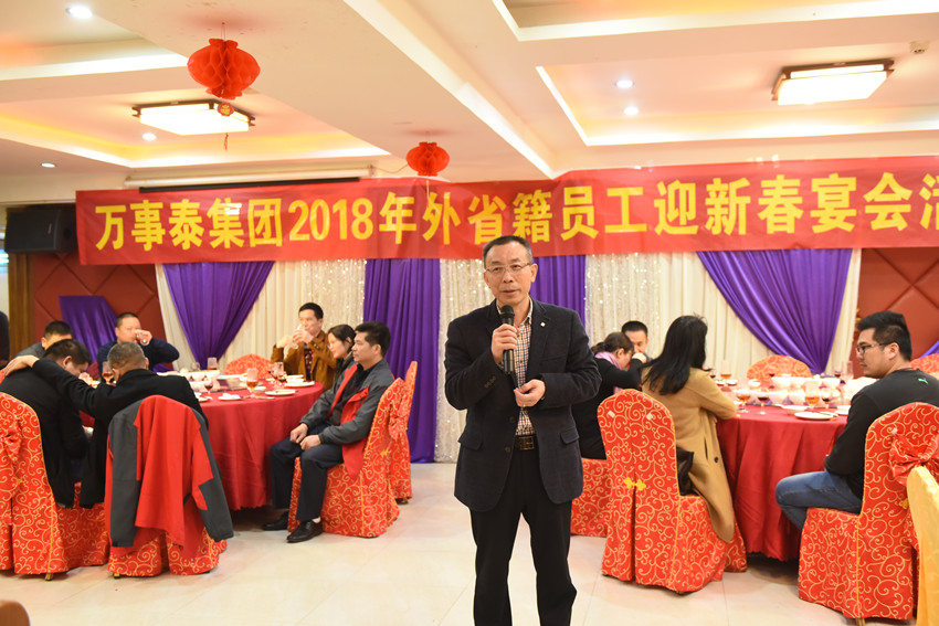 集团讯 新春佳节将至,2月10日晚,万事泰举办了2018年外省籍员工迎新春宴会活动。万事泰集团常务副总裁刘炳耀等集团领导出席活动,并与留在集团过年的外省籍员工及家属共享团年饭。