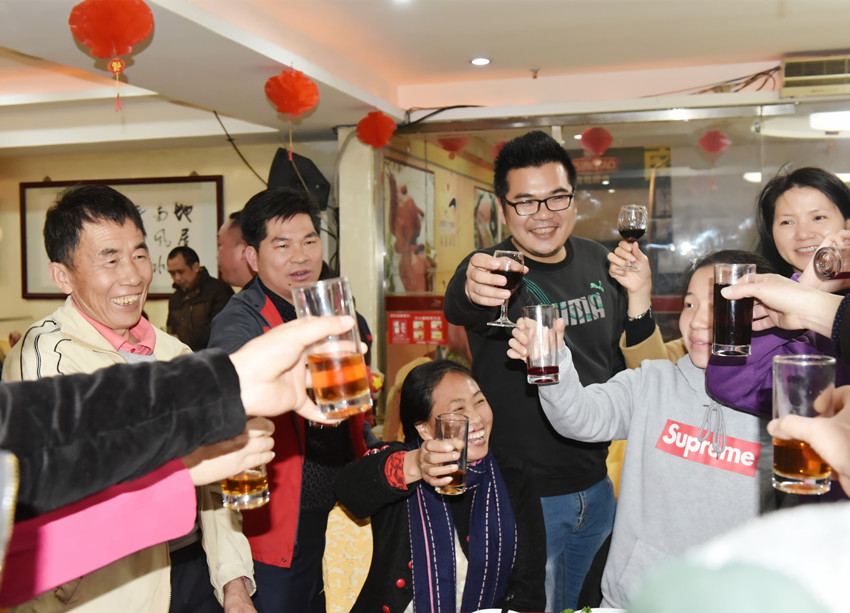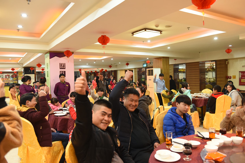 席间,不同乡音,不同笑脸,相互祝福,共叙浓浓情,同喝美酒,同品佳肴,共迎幸福年,浓浓的年味弥漫在大家的脸上。