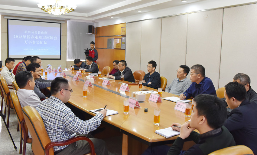 集团讯 3月7日上午,新兴县委县政府2018新春走基层(万事泰集团站)活动在集团总部会议室举行。新兴县委书记唐谊、县长袁伙月率领县四套班子领导及县委县政府相关部门负责人一行到我司座谈交流,县领导梁锦钊、梁国华、陈达栋参加活动。万事泰集团董事长梁桂泉、常务副总裁刘炳耀热情接待并参加座谈。