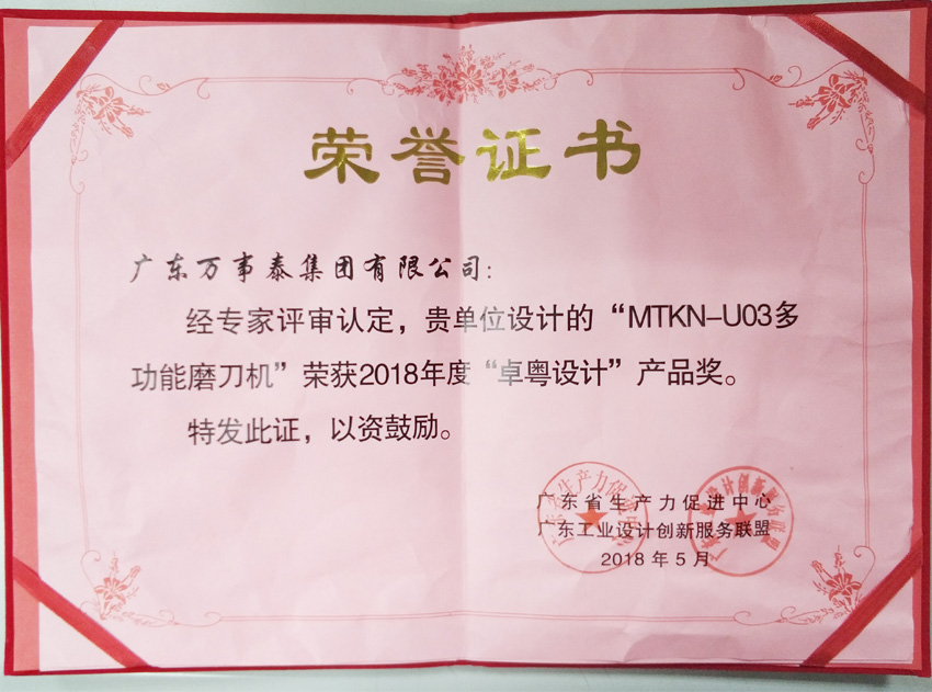 集团讯 5月31日,在广东省生产力促进中心主办的工业设计创新服务联盟大会上,万事泰旗下电器公司产品MTKN_U03多功能磨刀机凭借优秀的设计和创新的技术脱颖而出,荣获“卓粤设计”产品奖,这是对万事泰设计创新水平的高度肯定。