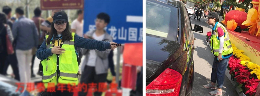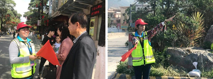 春节期间景区交通流量成倍增加,万事泰志愿者团队身穿红马甲、手拿小红旗,在交通岗上引导司机和行人按照路况安排行进,还有志愿者分散在周围路口,挥动小旗、吹着哨,进行交通引导,协助交警维持交通秩序,全天候地开展景区秩序维护、安全疏导、协调帮助等志愿服务工作。