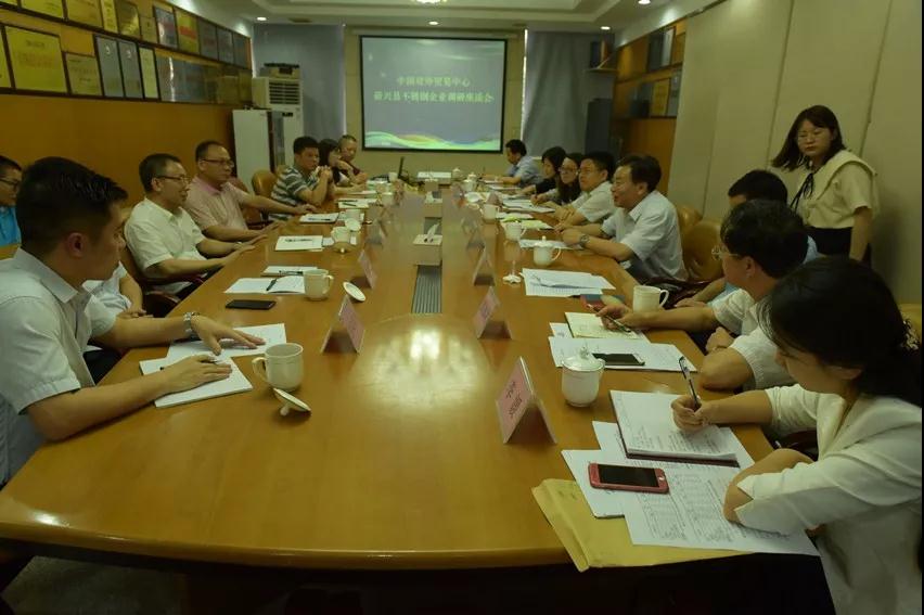 6月24日下午中国对外贸易中心对新兴县不锈钢企业调研会议在万事泰集团会议室召开。中国对外贸易中心副主任徐兵一行6人及云浮市副市长施东红、市商务局局长陈金进等市县领导,万事泰集团常务副总裁、县不锈钢商会会长刘炳耀、总裁办主任梁贤武等集团领导共同参加了这次会议。会议由云浮市商务局局长陈金进主持。