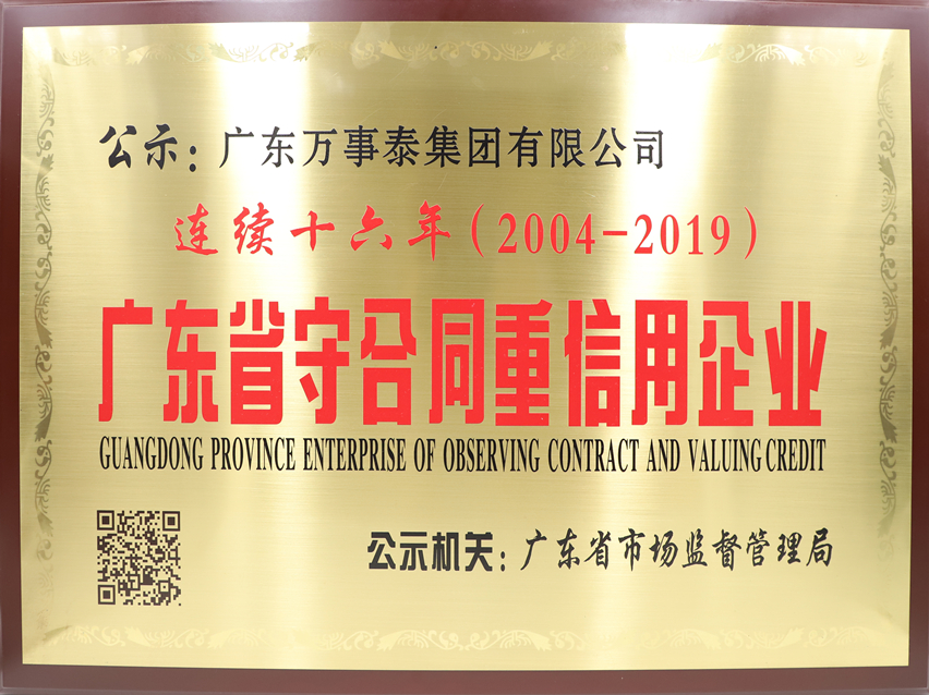 万事泰集团连续十六年获“广东省守合同重信用企业”称号