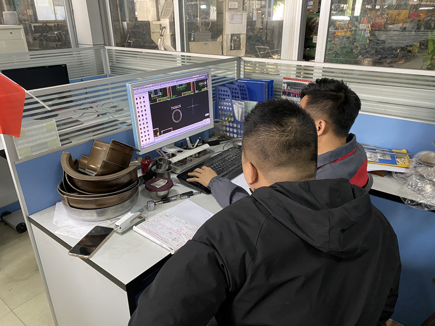 经过工程部办公室,传来一阵教学的声音:“模型这里分开标数,这些数据代表......”走进一看,是一对师徒正在描绘着图纸,交流着CAD操作技术。师傅陈伟强用高标准、严要求的原则教导徒弟,言传身教地带领徒弟在万事泰一步步前进。