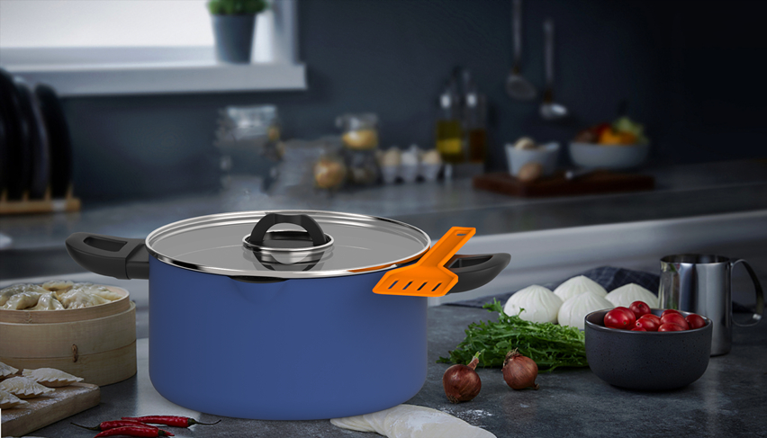本次获奖的水平系列锅具去繁从简,实用至上,兼顾简约设计。采用铝制锅身,加热速度快,大大缩减烹饪时间,提高烹饪效率及减少燃料的使用。盖耳做了特殊的可折叠结构设计,配合下沉式玻璃盖进行装备,使得整套锅具完美地实现了锅盖可平放堆叠的功能。一个套装,6种玩法,集煎煮焖炖炸多种功能,带给烹饪者更多的烹饪乐趣。