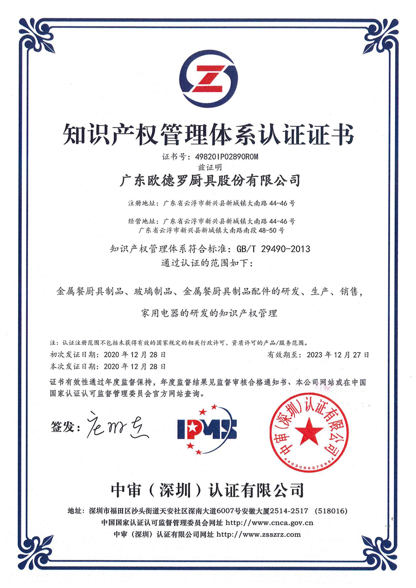 集团讯 日前,广东欧德罗厨具股份有限公司顺利通过《企业知识产权管理规范》的认证评审,荣获“知识产权管理体系认证证书”。