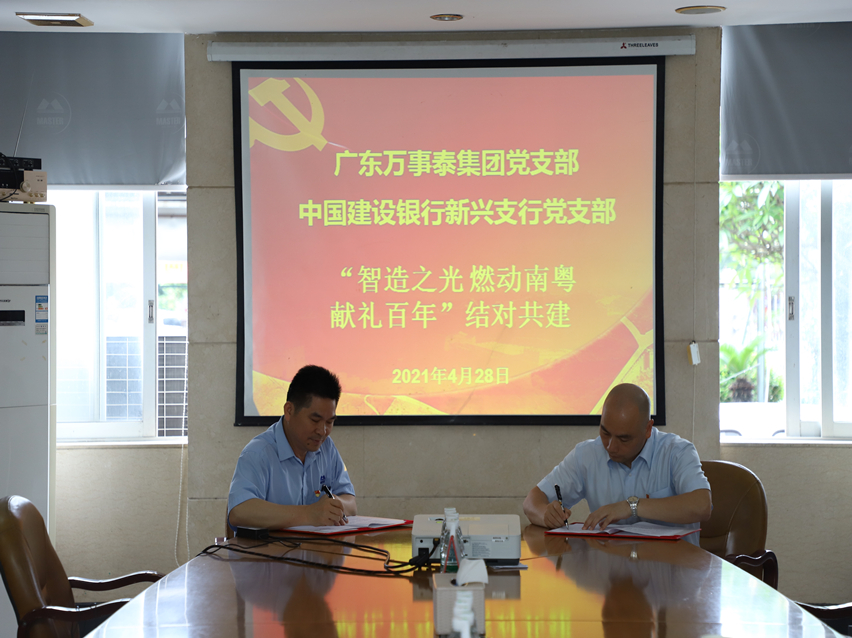 集团讯 4月28日上午,建设银行新兴支行党支部书记罗国良带领其党支部党员代表到万事泰集团开展党建结对共建活动和签约仪式,万事泰集团党支部书记梁洪光、行政部总监陈永锦以及党员代表10余人参加活动仪式。在活动仪式上,建行党支部书记罗国良与万事泰集团党支部书记梁洪光续签结对共建协议书。三年前建设银行新兴支行党支部与万事泰集团党支部已经签订党建结对共建协议书,今年期满继续签订。